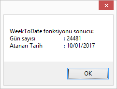 Değişken = d7Date Nesnesi.WeekToDate(Yıl, YılınHaftası, HaftanınGünü)